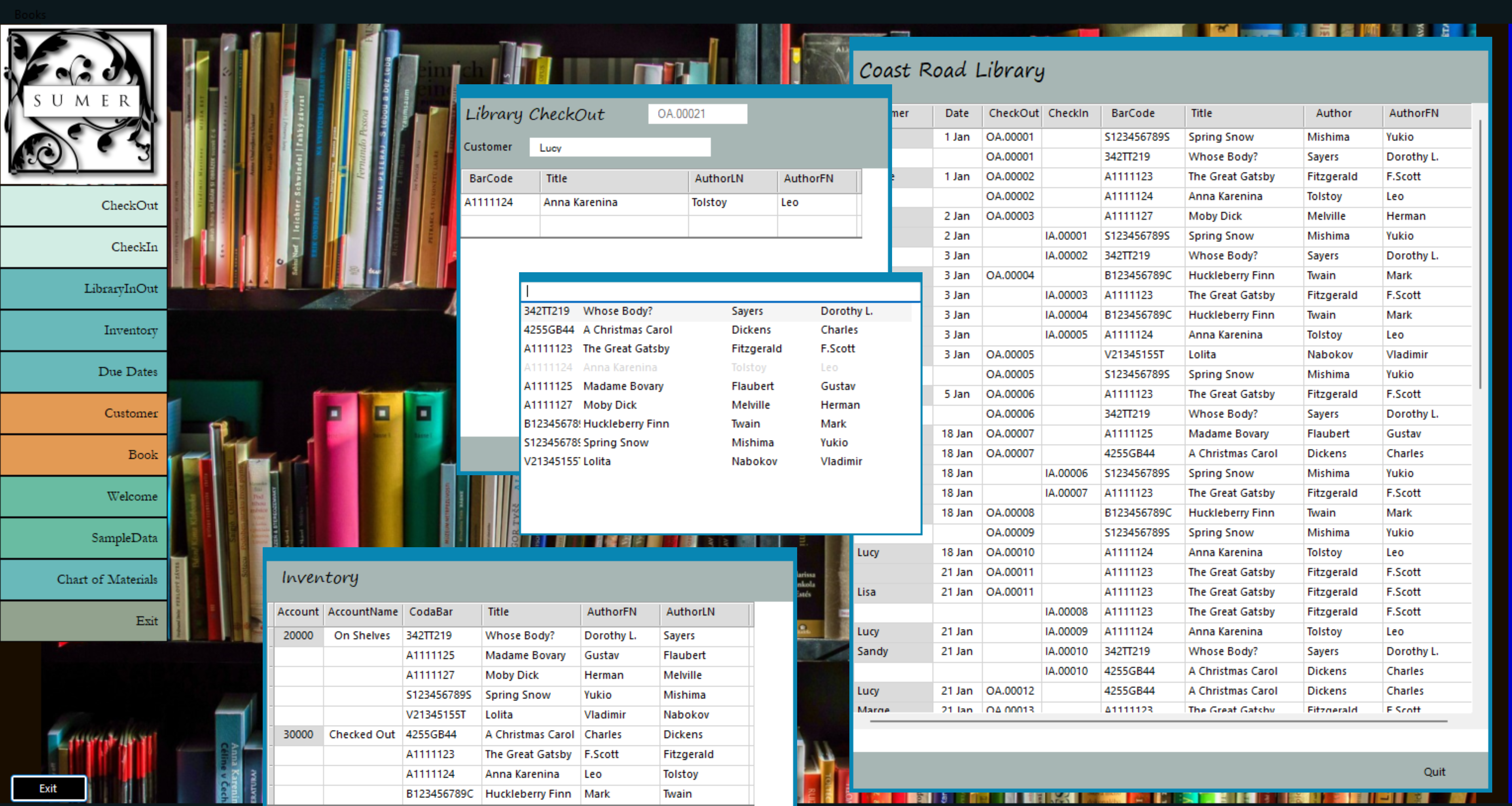 This library tracks books, check-outs, check-ins, due dates and everything else a small library needs.